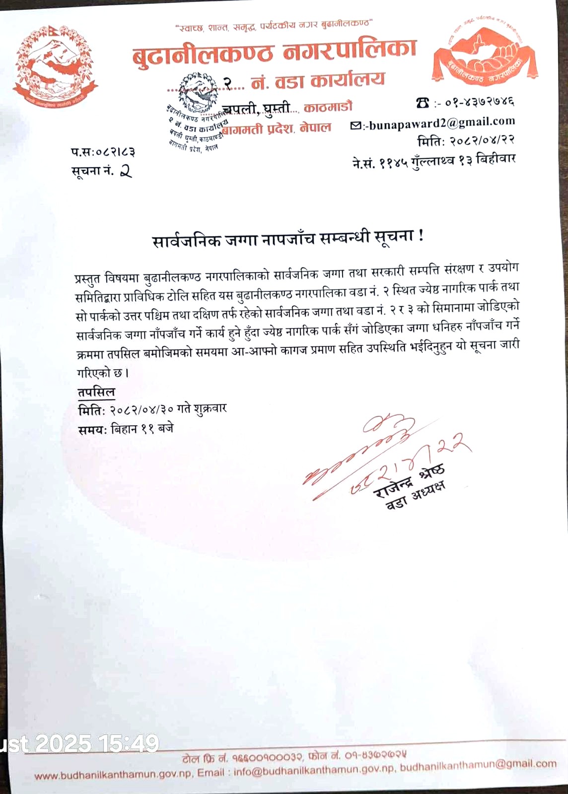 सूचना अनुसार बुढानीलकण्ठ नगरपालिका वडा नं. २ मा पर्ने ज्येष्ठ जागरीक पार्क तथा त्यसको उत्तर, पश्चिम र दक्षिण दिशामा रहेको सार्वजनिक जग्गामा र वडा नं. २ र ३ को सिमानामा जोडिएको सार्वजनिक जग्गा नापजाँच कार्य गरिनेछ। सो नापजाँच कार्य श्रावण ३० गते (शुक्रबार), बिहान ११ बजेबाट सुरु हुनेछ।