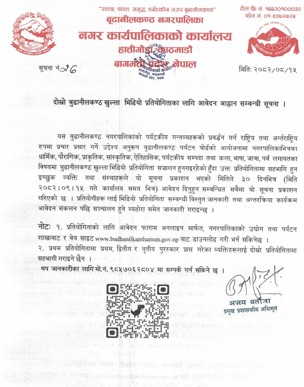 बुढानीलकण्ठ नगरपालिकाले स्थानीय धार्मिक, सांस्कृतिक, ऐतिहासिक र प्राकृतिक गन्तव्यहरूको राष्ट्रिय तथा अन्तर्राष्ट्रिय स्तरमा प्रवर्द्धन गर्ने उद्देश्यसहित ‘दोस्रो बुढानीलकण्ठ खुल्ला भिडियो प्रतियोगिता’ सञ्चालन गर्न लागेको जानकारी गराएको छ। बुढानीलकण्ठ पर्यटन बोर्डको आयोजनामा हुन लागेको यो प्रतियोगिताका लागि इच्छुक व्यक्ति तथा संस्थाहरूलाई ३० दिनभित्र आवेदन दिन आह्वान गरिएको छ।