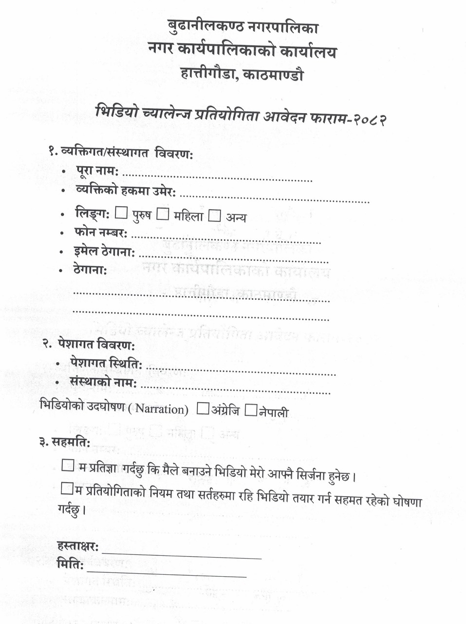 प्रतियोगिताको आवेदन फाराम अनलाइन मार्फत, नगरपालिकाको उद्योग तथा पर्यटन शाखा तथा www.budhanilkanthamun.gov.np वेबसाइटबाट डाउनलोड गरी भर्न सकिने व्यवस्था मिलाइएको छ। यद्यपि, पहिलो संस्करणका प्रथम, द्वितीय तथा तृतीय विजेताहरूलाई यसपटकको प्रतियोगितामा सहभागी गराइने छैन भन्ने जानकारीसमेत सूचना मार्फत सार्वजनिक गरिएको छ।