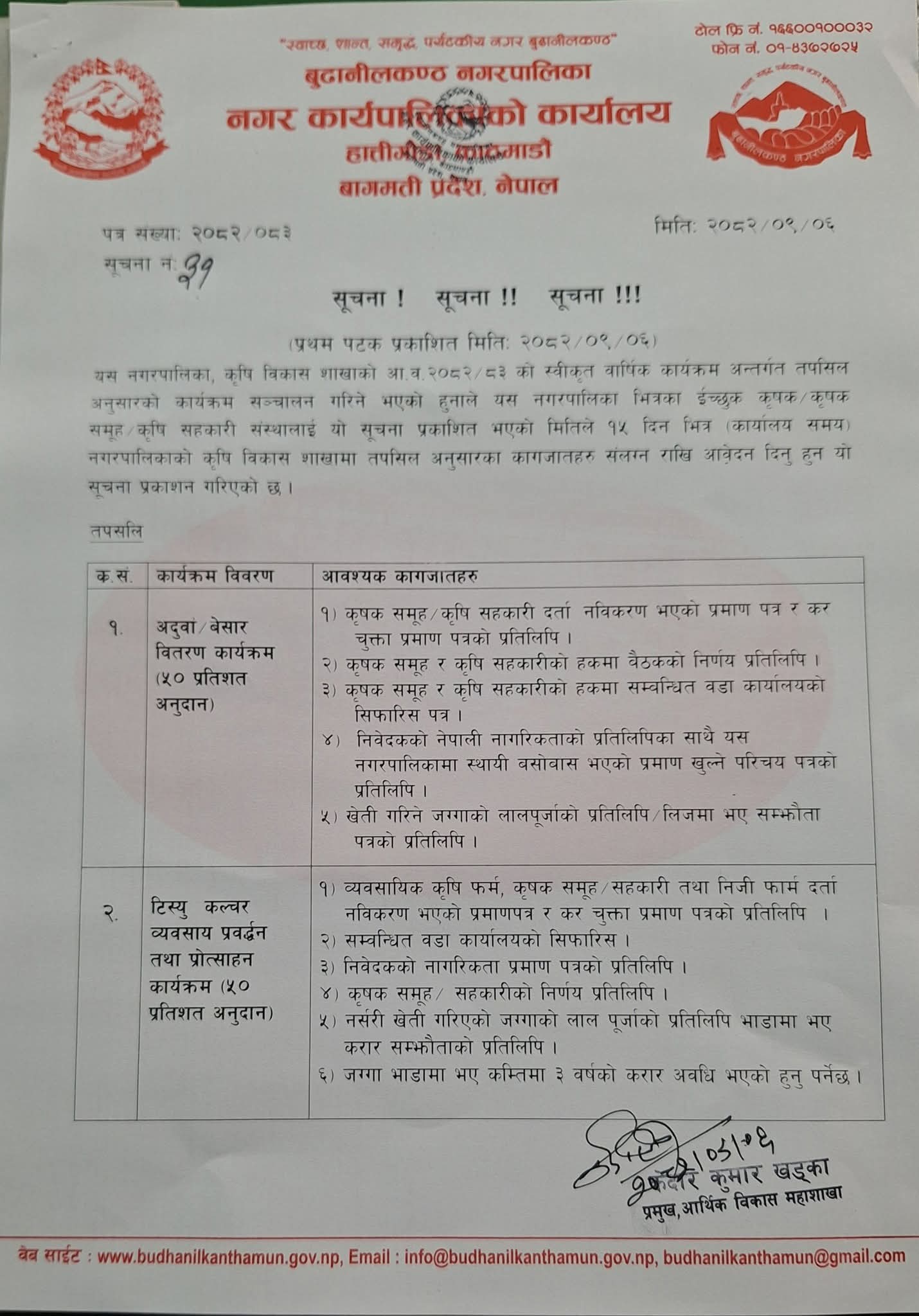 नगरपालिकाले यी कार्यक्रममार्फत कृषि उत्पादन वृद्धि, आधुनिक प्रविधिको प्रयोग, व्यवसायिक कृषिको विस्तार तथा कृषकको आयस्तर सुधार गर्ने लक्ष्य लिएको जनाएको छ। थप जानकारीका लागि बुढानीलकण्ठ नगरपालिकाको कृषि विकास शाखामा सम्पर्क गर्न अनुरोध गरिएको छ।